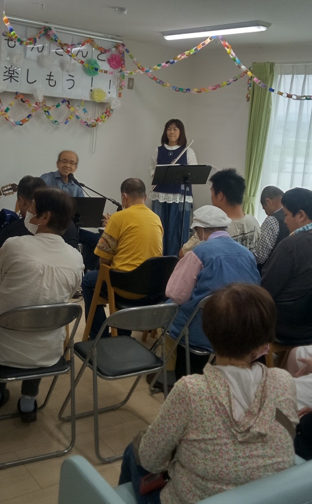 司波多聞さんをお迎えして音楽イベントを開催しました。地域の方々もお招きし、入居者様、ご家族、職員で楽しみました。